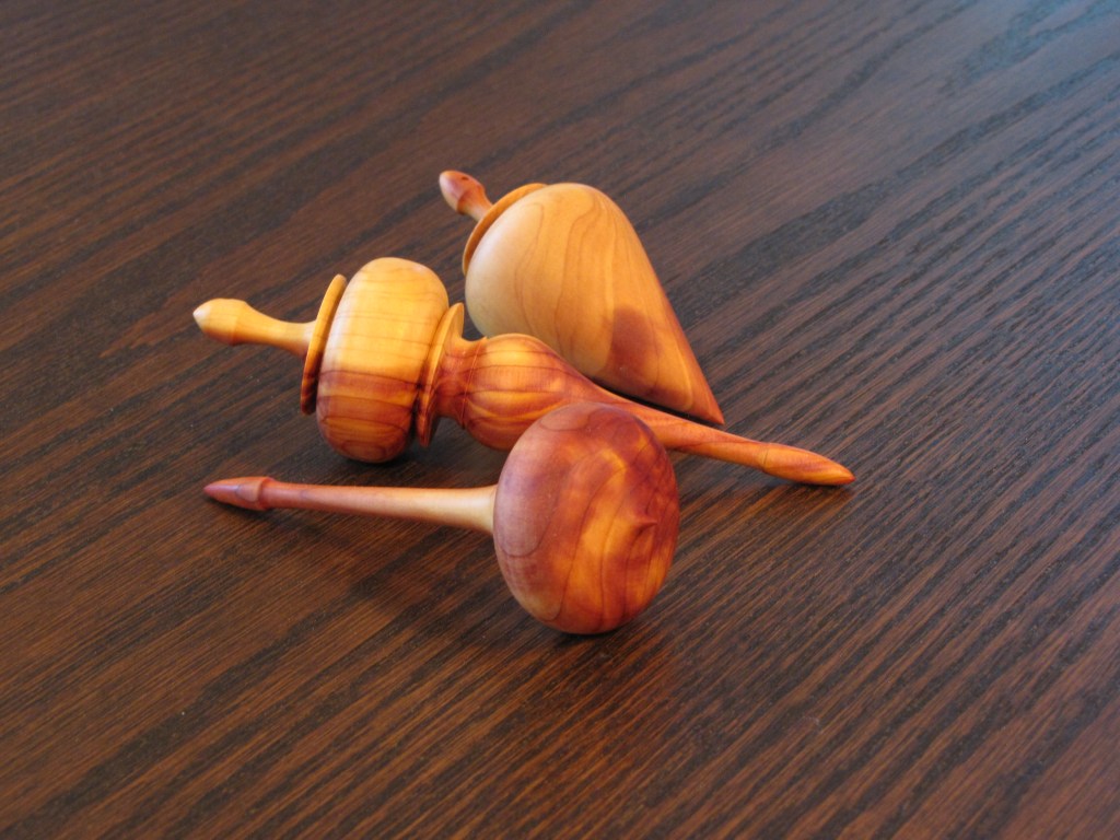 Hand turned Christmas ornaments of red and white cedar.