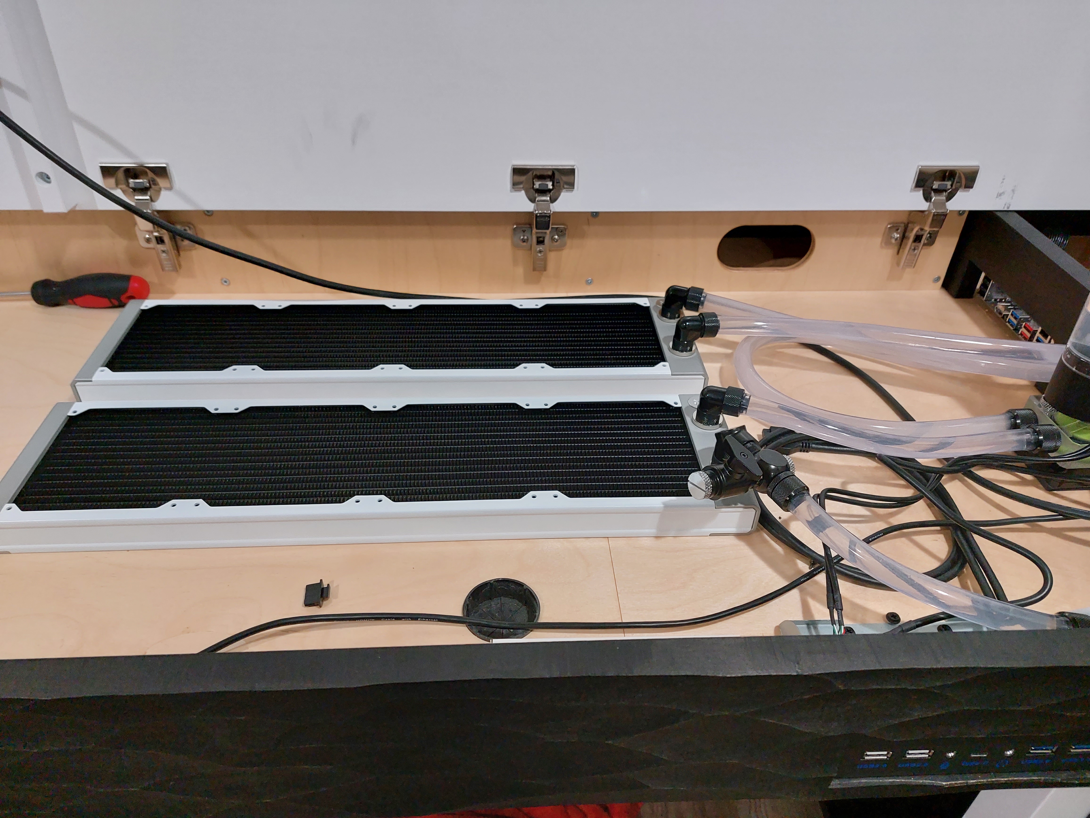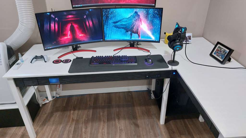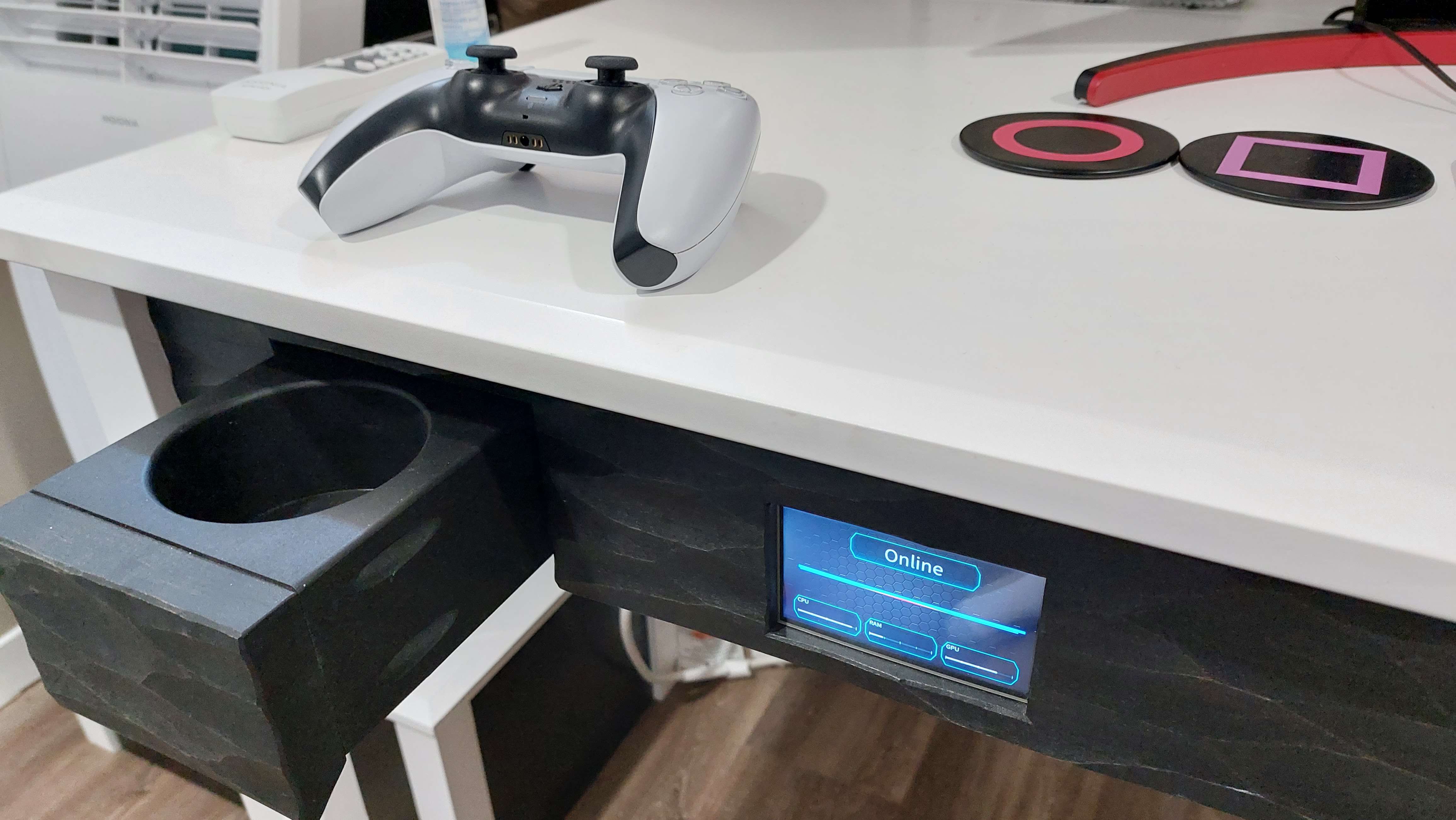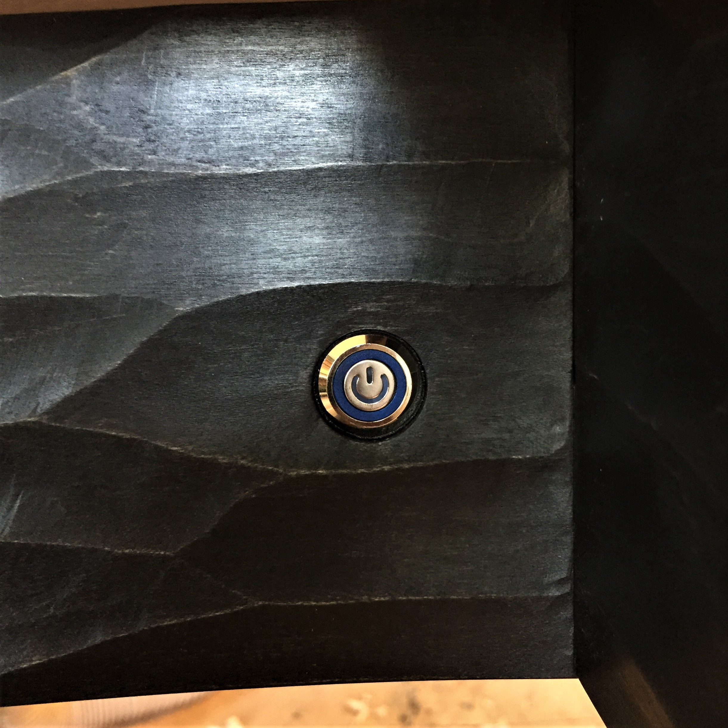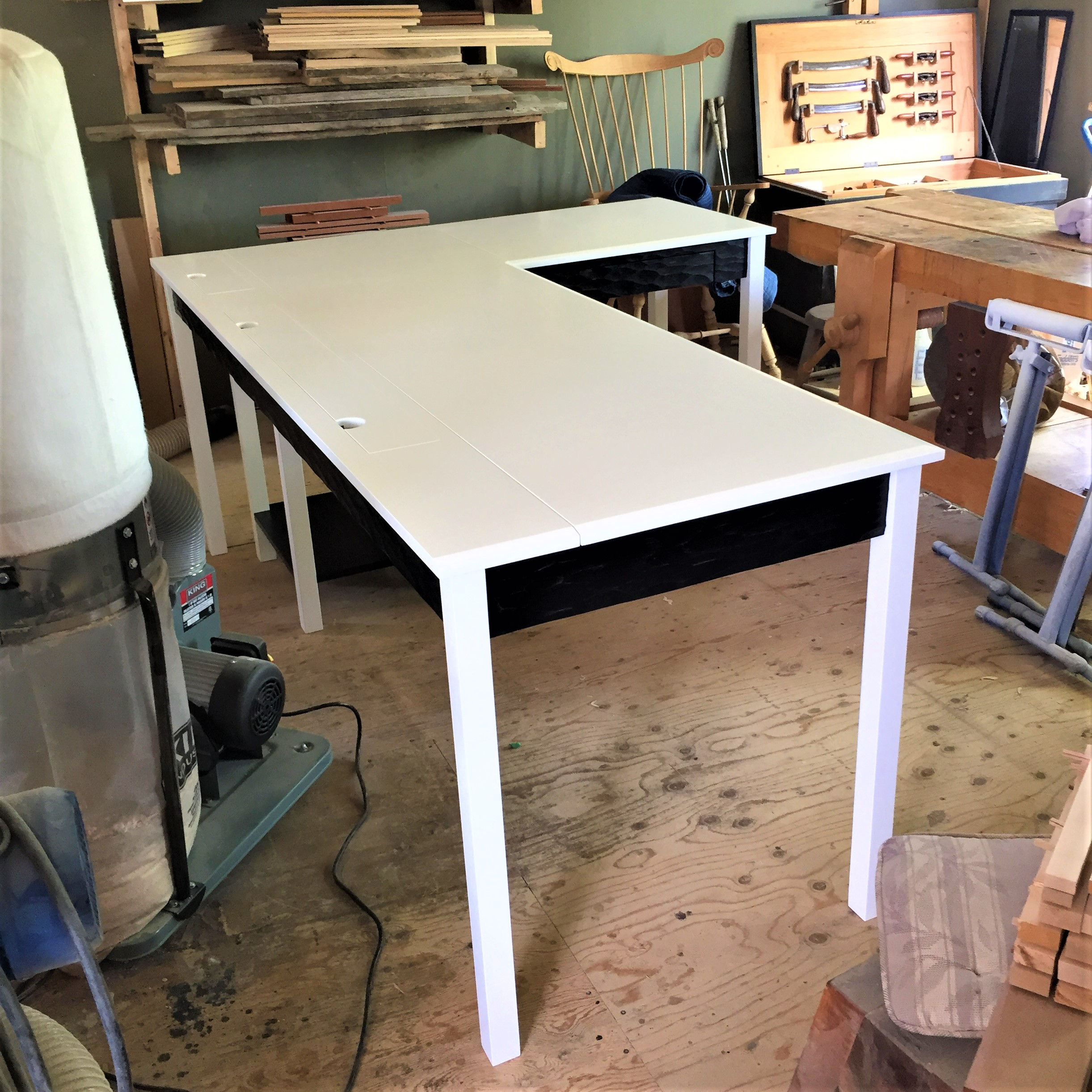Designed from the ground up between the client and myself, this PC desk has both functionality and style. Mounting hardware built within the desk gives room to expand and update the system out of sight. Wire routing holes underneath and throughout the interior provide options for clean and organized wire management. With a hinged main top and magnet mounted access covers you can easily make changes when needed. Assembled with sliding dovetail, Allen-key bolts, and magnets, this desk knocks down to make it manageable to move in and out of small spaces. The white lacquer finish and stain carved maple top off this one of a kind design.