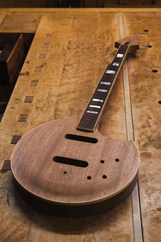Solid mahogany body, rosewood fret board with pearl inlay and ebony accents.