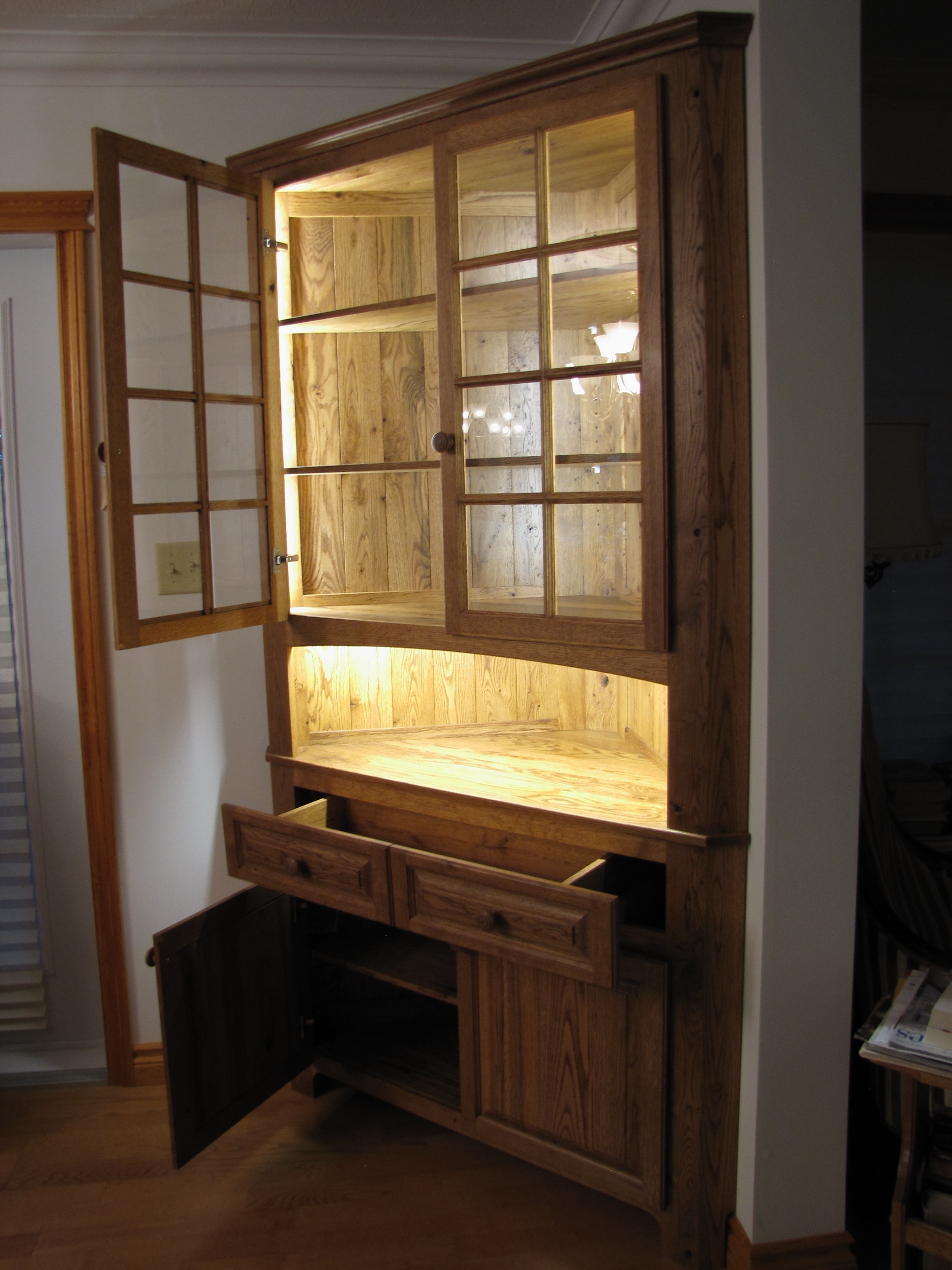 Corner cabinet built from client’s oak felled on their property. Hand cut dovetail drawer, full-extension soft close slides, built in LED lighting, and adjustable shelves. Designed to fit the client’s space and style alongside a Living Room Set.