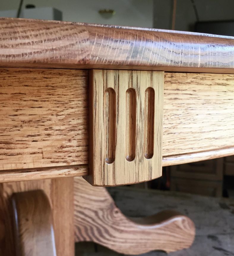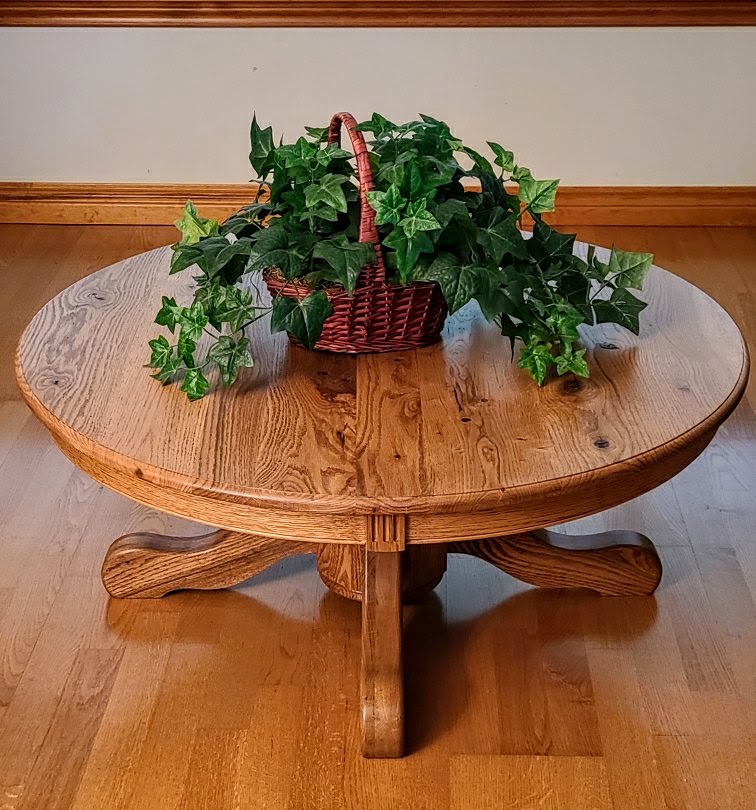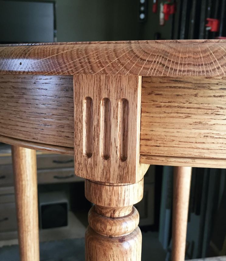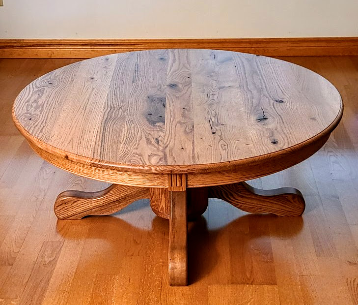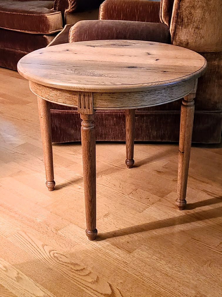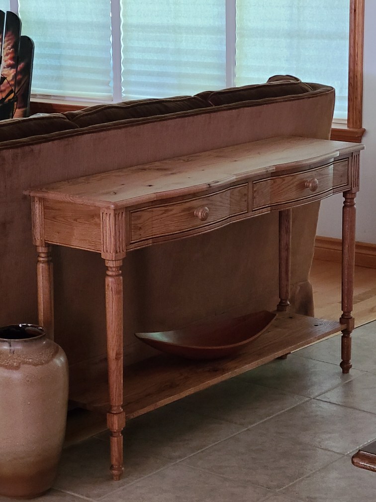 A living room set consisting of a side table, coffee table, and console table. Traditional design developed alongside the clients. Using only oak from their property, these pieces were made to fit their space and needs. Solid oak table skirts were steam bent to shape and book-matched veneer was made for the console drawer fronts. Custom moldings and knobs to match a Corner Cabinet previously made for the clients.